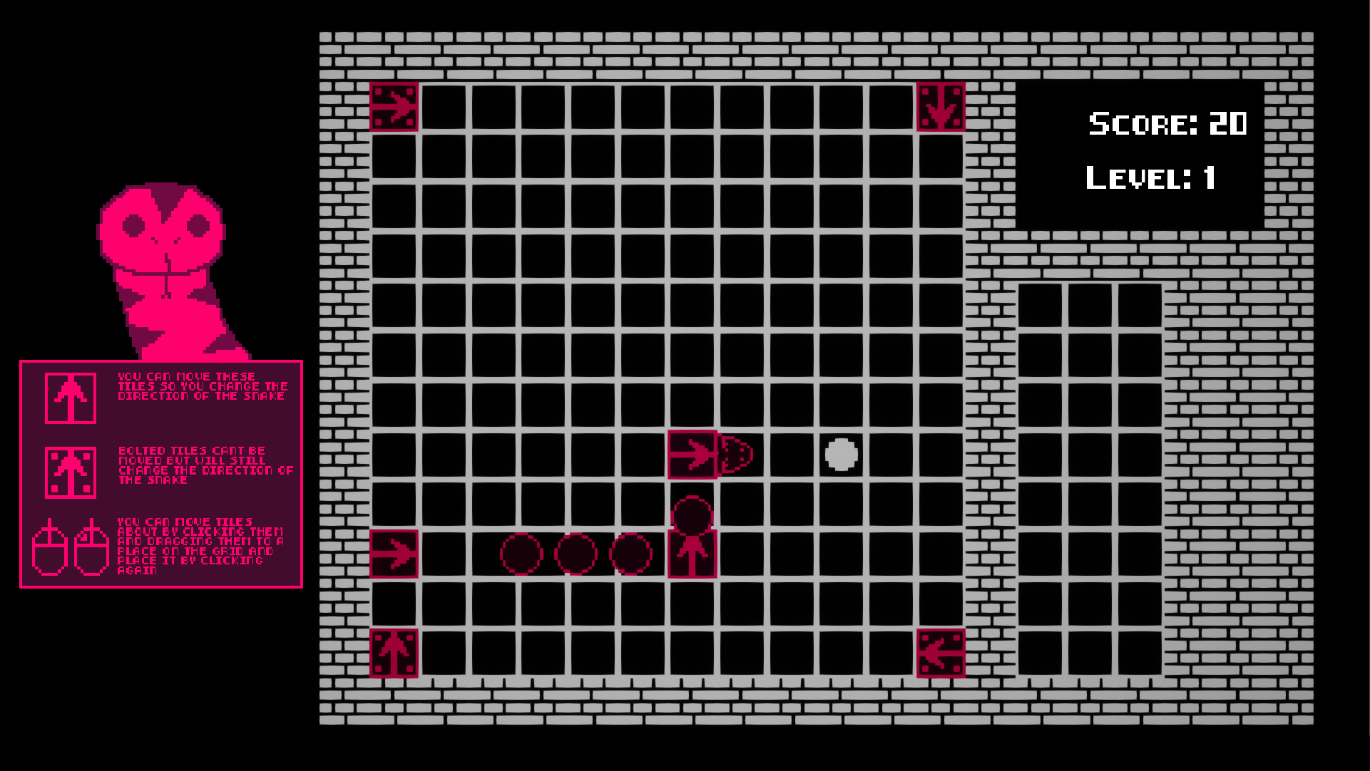Help a snake with eating all the pits by showing them the way. You assist the snake by using the directional arrows to show them the way and to eat the pits by dragging the tiles from your inventory in the path of the snake.